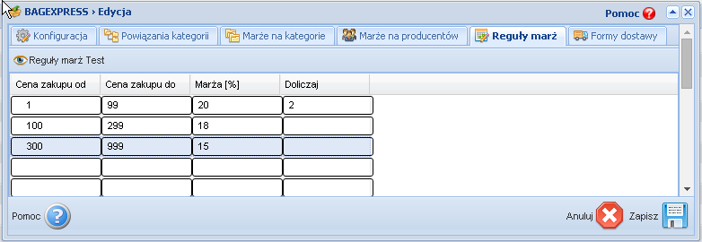 - rules for margins (depending on product prices)